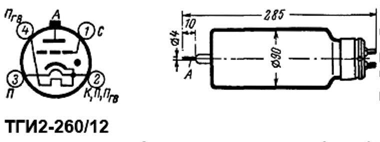 ТГИ2-260/12 тиратрон импульсный модуляторный относится к разделу электровакуумных приборов и ламп различного назначения. По конструкции тиратрон импульсный модуляторный состоит из вакуумно-герметичной, жесткой оболочки, внутри которой отсутствует кислород.