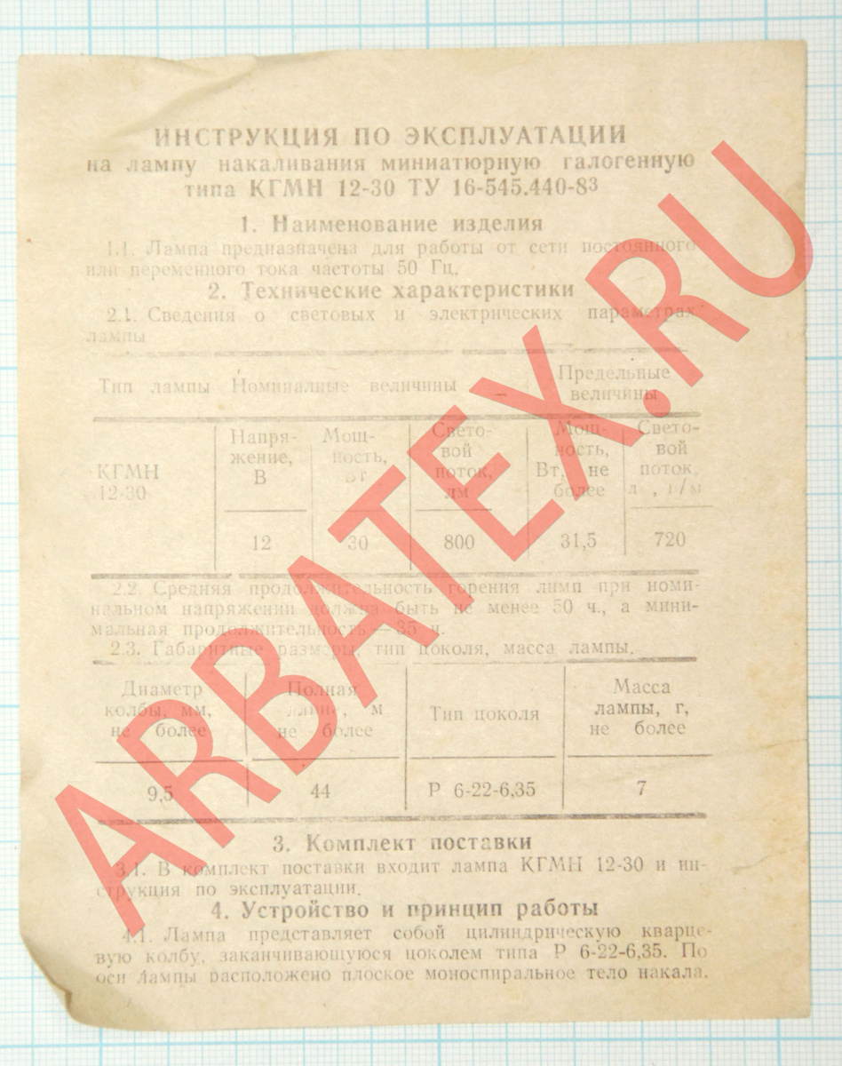 КГМН 12-30 лампа накаливания кварцевая галогенная малогабаритная предназначена для использования в качестве высокоинтенсивных источников света в оптических приборах, относится к разделу электровакуумных приборов и ламп различного назначения. По конструкции состоит из вакуумно-герметичной, жесткой оболочки, внутри которой отсутствует кислород.